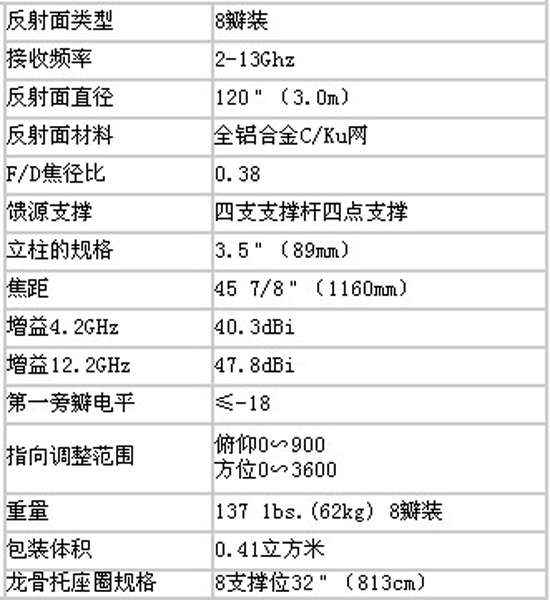 S/C/Ku兼(jiān)容網麵:采用美國設計的高強度S/C/KU鋁(lǚ)合金網製造,確保接收各頻段的最佳性能。