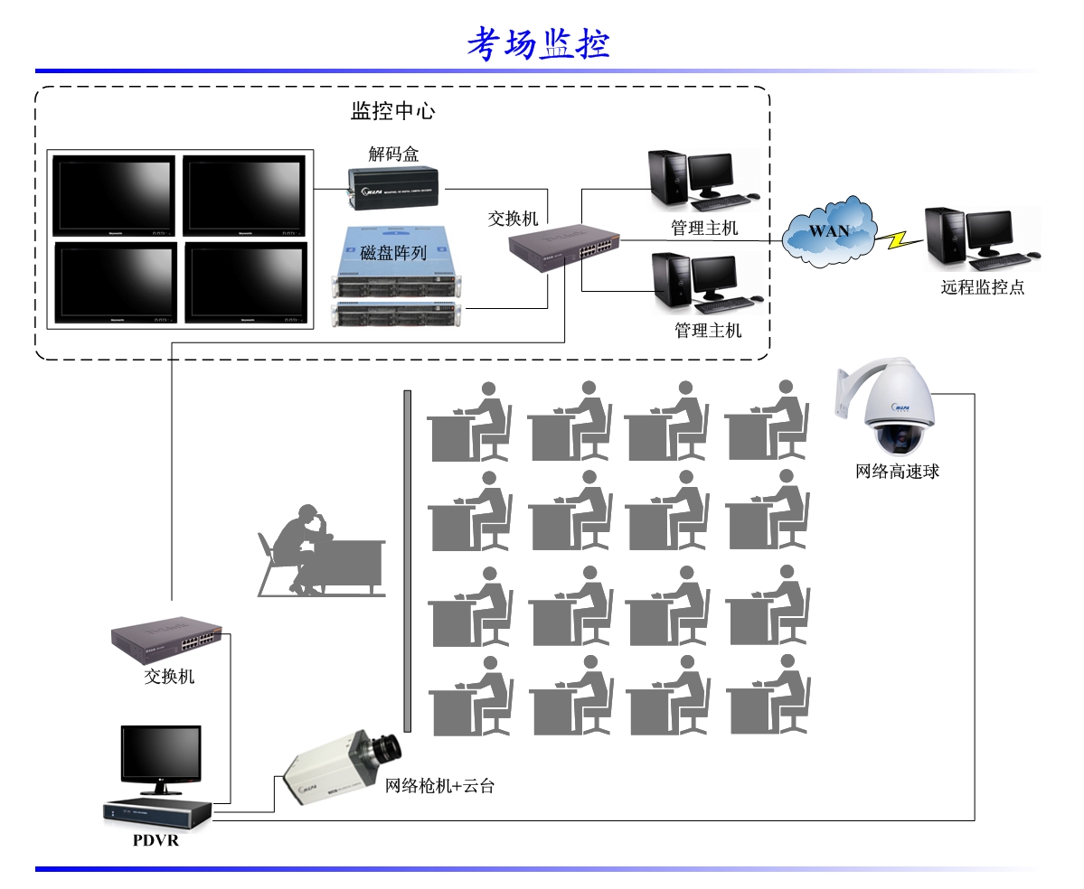利用視頻(pín)監控係統,可以對考場的多(duō)個考點進行有效的(de)監控,並進行實時錄(lù)像;通過使用網絡高速(sù)球,可以方便的(de)查看整個考場的情況。由於係統采用數字化音、視頻技術,比(bǐ)起電視監控係統擁有更好的穩定性和圖像質量,也有(yǒu)更大的存儲空間,能方便的將考場情況的資料拷(kǎo)貝出來永久保存(cún)。