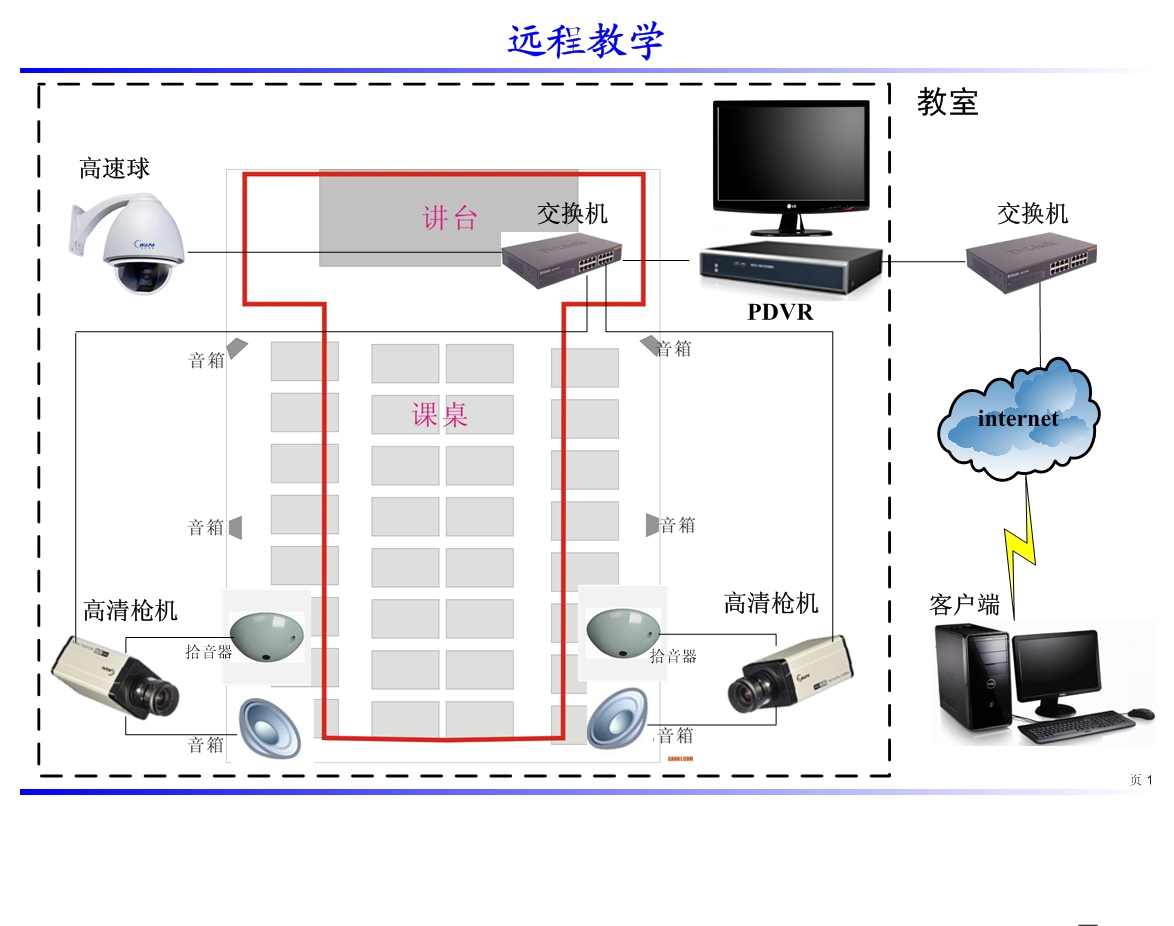 利(lì)用視頻監控係統,可以對教學示範課進行直播,還可以進行實時錄像;聽教學示範課的人員不需要進入(rù)授課現場就可以看到教學示範的實況。通過視頻服務器,外(wài)地觀摩(mó)的(de)教師可以方便的通過寬帶網絡查看整個教學(xué)示範課的(de)情況;同時還可以將教學示範課的錄像製成光盤永久保存,便於以後(hòu)使用。學校監控解決方案的方案圖如圖所示。